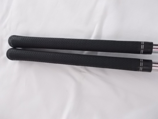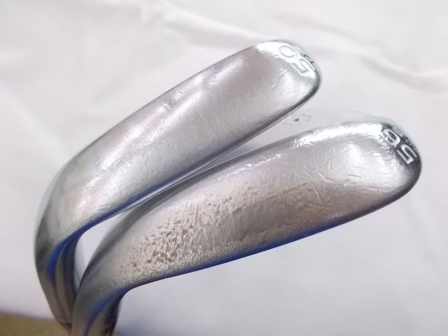 54°はノーメッキのSグルーブ、60°はツアークロームのMグルーブです。Mグルーブが開きやすく気に入ってるので54°もいづれMグルーブにする予定。アイアンは48°まで入れてるので、PW43°、48°、54°、60°のピッチが今のところ合ってるみたいです。